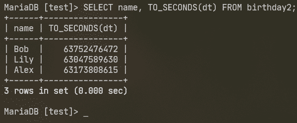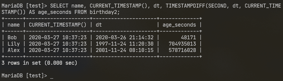 dt, CURRENT_TIMESTAMP()) AS age_seconds FROM birthday2;
