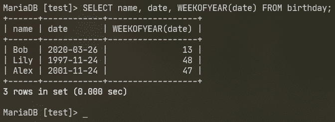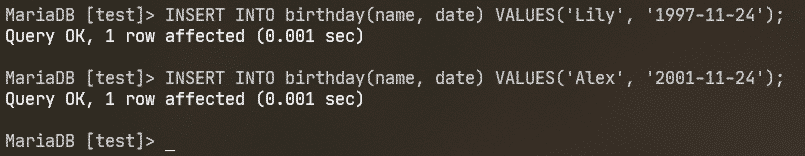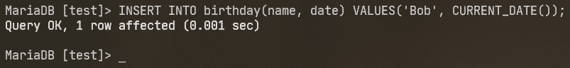 If you want MySQL/MariaDB to automatically add the current date or current time while inserting new rows into the birthday table, you can create the birthday table as follows.