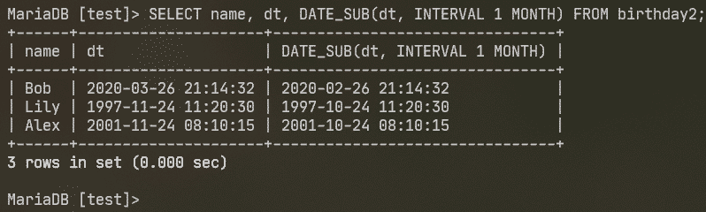 The same way, you can subtract a month using the DATE_SUB() function as follows: