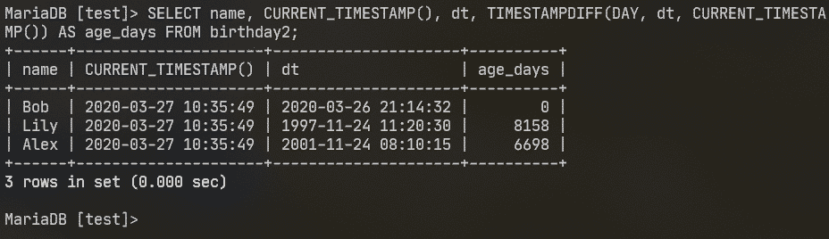 dt, CURRENT_TIMESTAMP()) AS age_days FROM birthday2;