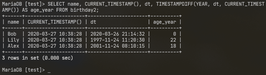 CURRENT_TIMESTAMP()) AS age_year FROM birthday2;