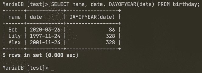 The same way, you can get the day of the year using the DAYOFYEAR() function. 1 year is equal to 365 days. 366 days in a leap year.