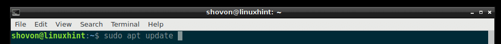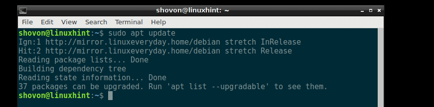 First update the apt package repository cache of your Debian 9 Stretch machine with the following command: