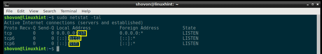 In the output of netstat, all the common ports are replaced by the service name by default. For example, the port 80 by default is the port for the HTTP (HyperText Transfer Protocol), which we all are familiar with. So in the output of netstat, it is shown as http instead of port 80 as you can see in the marked section of the screenshot below.