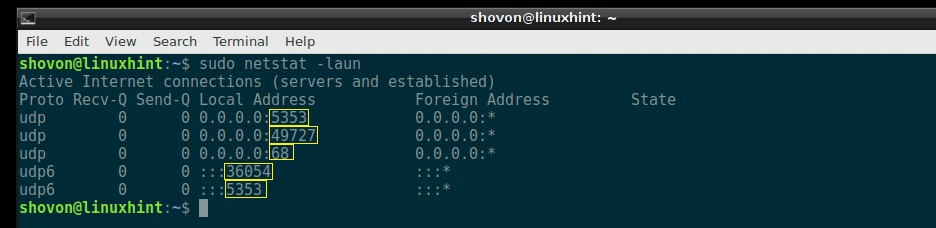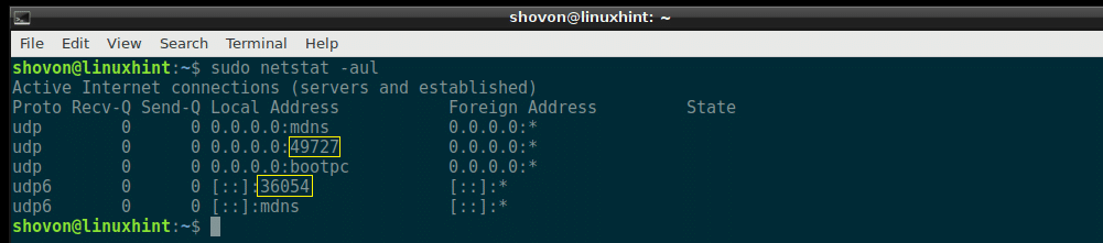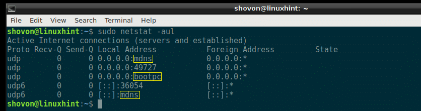 All the listening UDP ports should be listed. Just like the TCP port example, the common port numbers are replaced by the service names by default here as well, as you can see from the marked section of the screenshot below.