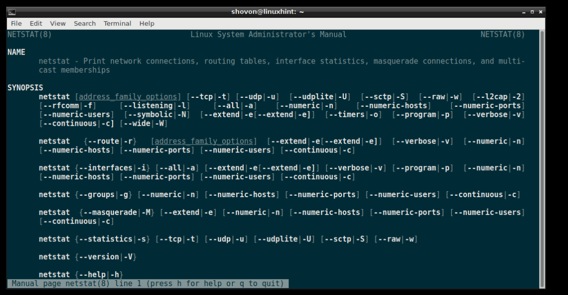 To go to the manpage of netstat, run the following command: