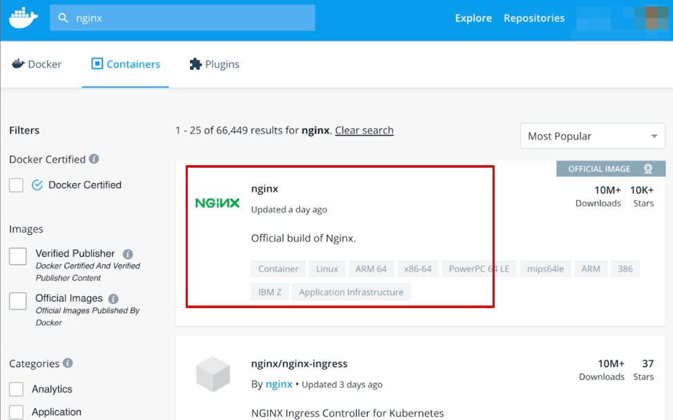 To search Nginx images, type nginx in the search bar and then click on the official Nginx link that will be displayed on the search results.