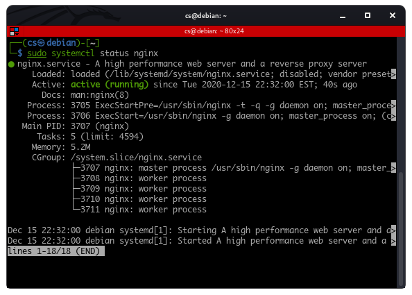 In most cases, NGINX is installed as a service and runs in the background. Although NGINX runs in the background, there are ways to view the service status using the systemctl utility.