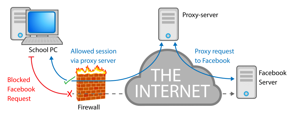 A proxy server is the one that talks to the Internet on your behalf. For example, if your college’s network has blocked https://www.facebook.com/ but the domain https://exampleproxy.com is still accessible, then you can visit the latter and it will forward all your requests for Facebook servers to Facebook, and send by the responses from Facebook back to your browser.