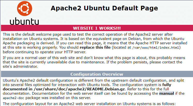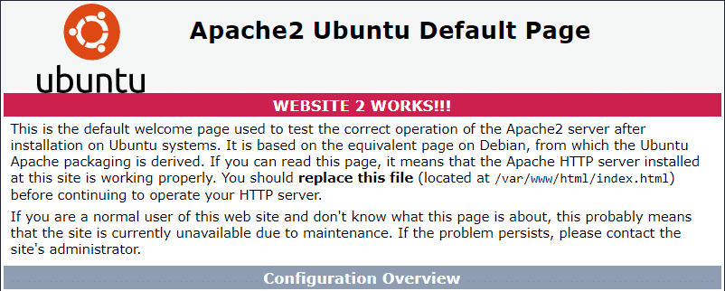Your websites may differ, but if you want to replicate this setup as a starting point, run apt install apache2 on Node-1 and Node-2. Then edit the file /var/www/html/index.html so that the web server says whatever you want it to say.