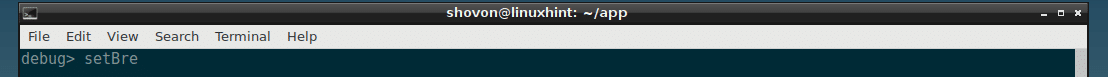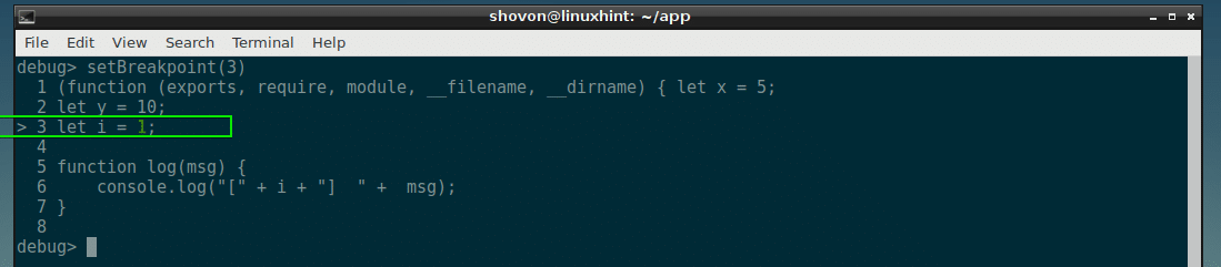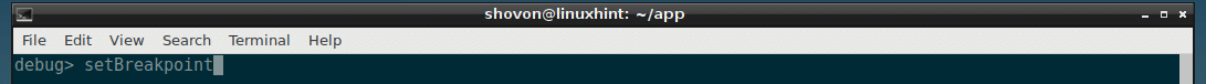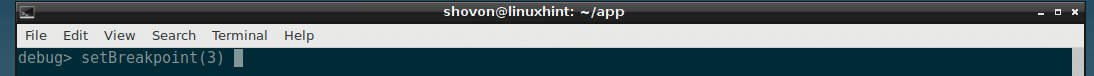 To set a breakpoint, you run the setBreakpoint() function. The function accepts an integer parameter as line number to which you want to set a breakpoint.