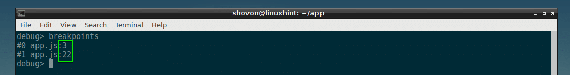 You can list all the breakpoints you have already set with the NodeJS debugger with the following command: