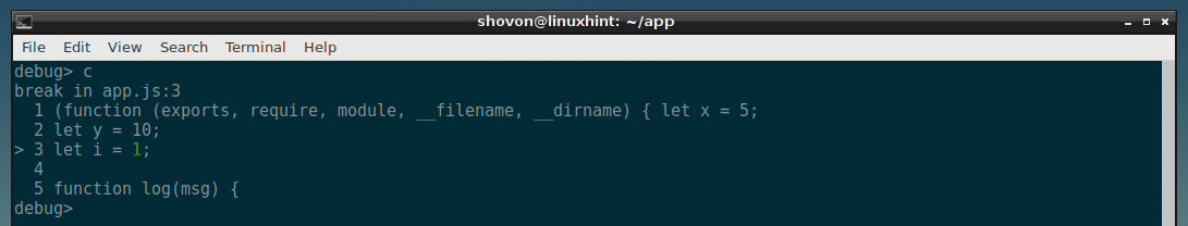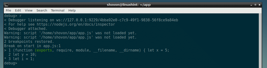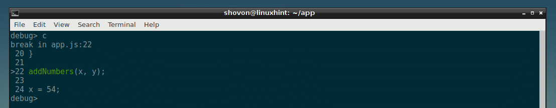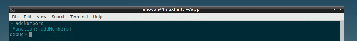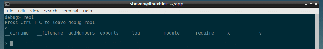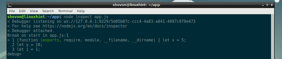 Now you can run many commands here to debug the NodeJS script app.js.