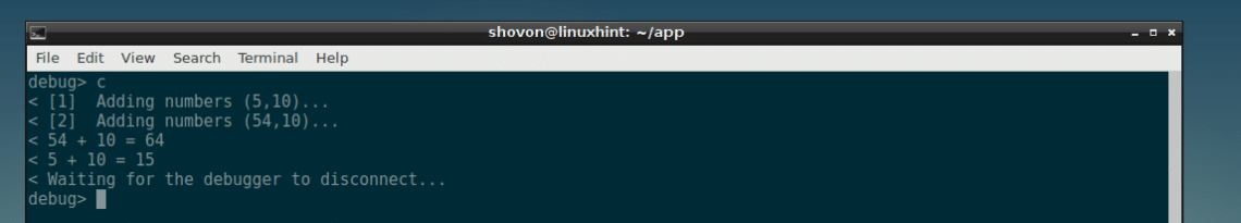 Running the c command again completes the program as there are no more breakpoints.