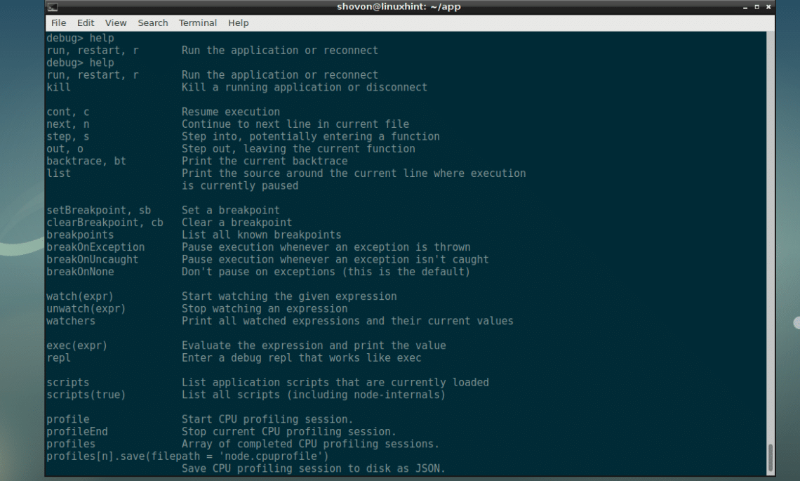 You can run the following command to get a list of commands and functions that you can use to debug a NodeJS script in the NodeJS debugger: