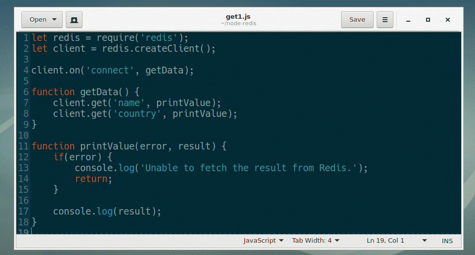 On line 7, I called the get(key, callback) method of RedisClient object. name here is the key of the value you want to retrieve. get() method calls the printValue callback function before it finishes running.