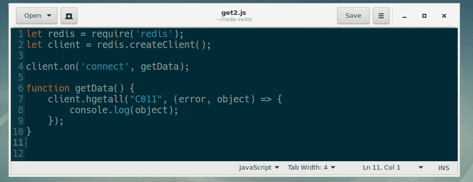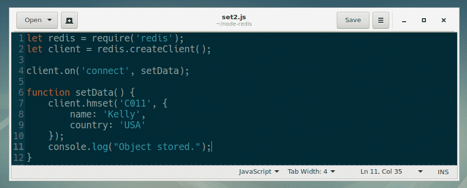 In line 7-10, I used client.hmset() method to store a JavaScript object in the Redis data store against the key C011.