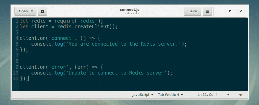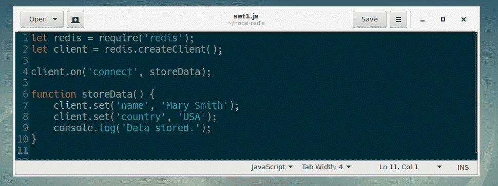 On line 4, I set the callback function of the connect event to storeData. So, when our Redis client is connected to the Redis server, the function storeData is called.