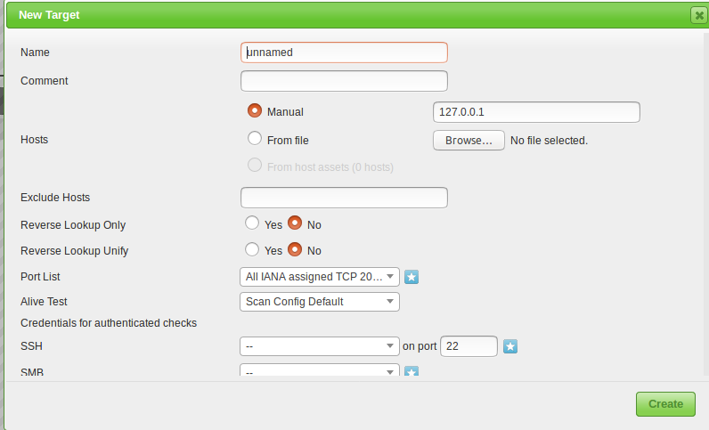 Credentials for authenticated checks: You can add your system’s credentials to allow Openvas check for local vulnerabilities.