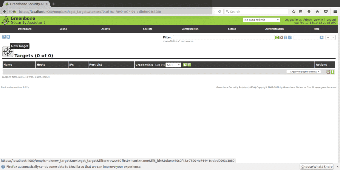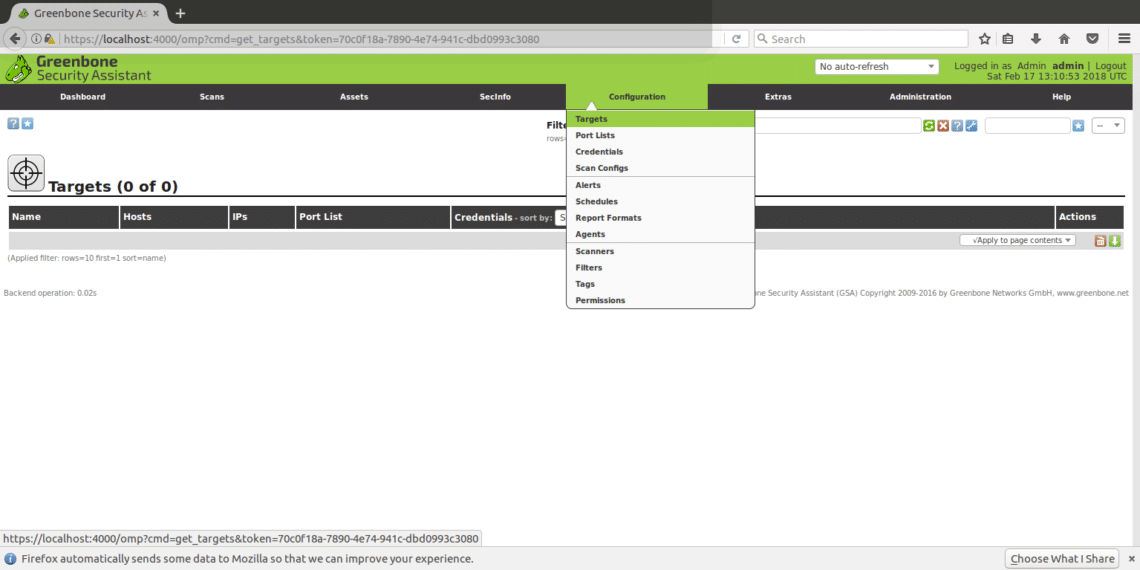 Login using “admin” both as user and password and once inside go to “configuration” and “target”.