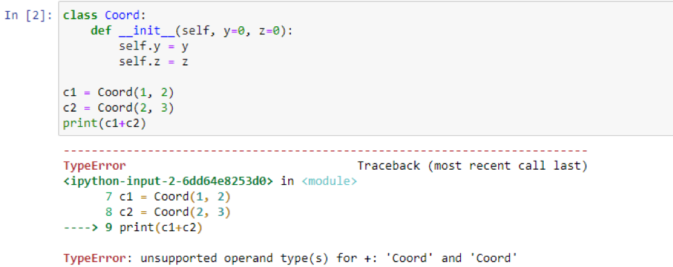 Well, what comes if we use these operators for objects in a user-defined class? Let us take the following program that attempts to simulate a spot in the 2-D scheme of dimensions. Below, you can already see that because Python did not understand how to join 2 coordinates instances, a Type Error is generated.