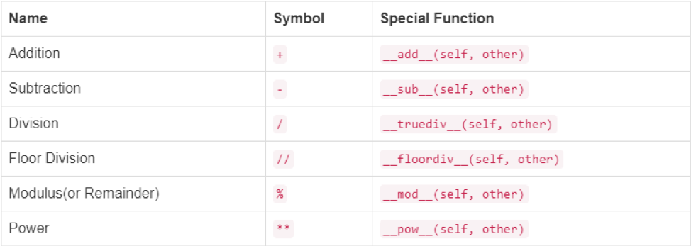 We can accomplish this task in Python via the operator overloading, but first of all, let’s understand the special methods.