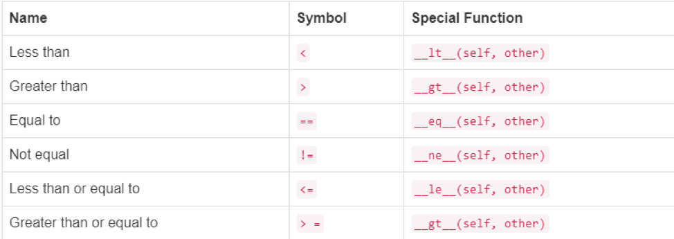 Below are the details of the magic functions for overloading the python comparison or relational operators.