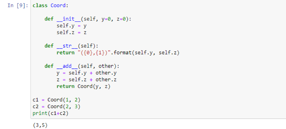 You will have to enforce the __add_() method in the class to overload the + operator. Great duty arrives with great strength. Inside this method, you could do anything you want. But it is much more rational to return the ‘Coord’ object of the coordinate sum.