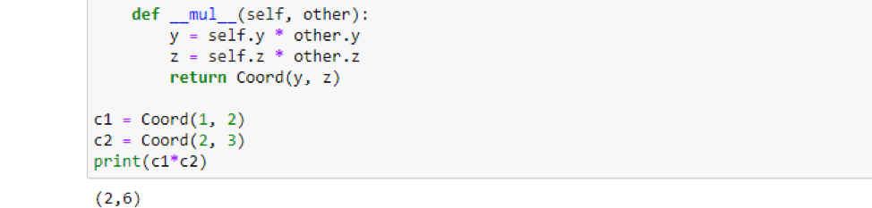 Likewise, you can even overload several binary operators using magic functions. In the same above example, while overloading the multiplication operator, we get 2, 6 as our answer to the magic function.