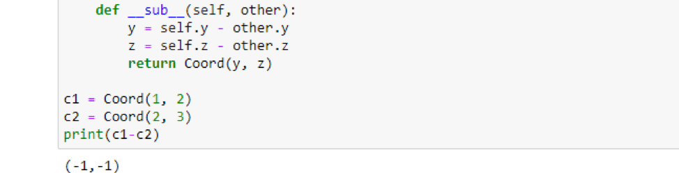 Object c1 has values of self.y=1 and self.z=1 right now. The object c2 values ‘other.y = -2’ and ‘other.z = -3’ has been passed to subtracted from object c1 values. As a result, c1 – c2 results self.y – other.y = 1-(-2) and self.z – other.z = 1-(-3). The calculated result, which is 3 and 4, has been saved into ‘self.x’ and ‘self.z’ due to the assignment operator of ‘=.’ On print, this code will output the result of object c1, which has two variables self.y = 3 and self.z = 4.