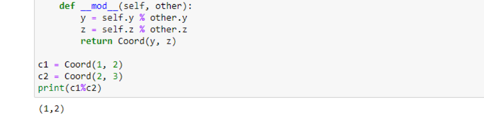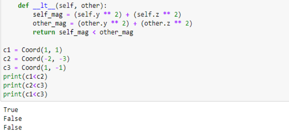 Assume we required less than the ‘<‘ symbol in our ‘Coord’ class to be implemented. Let us compare the value of these arguments from the source and yield the answer. As usual, it can be applied. We have three objects, and we are comparing them in print statements. As a result, we will get that object c1 is less than c2, so it outputs True. On the other hand, c2 and c1 are more excellent than c3; that’s why both False output.