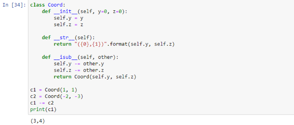 Have a look at an example of assignment operator overloading. We are taking a similar example with the overloading of the ‘-=’ assignment operator. We have defined two objects having values of y and z coordinates. First object c1 is passing its values to ‘self.y’ and ‘self.z’ variables, respectively. On the other hand, the object c2 is passing its values to ‘other.y’ and ‘other.z’.