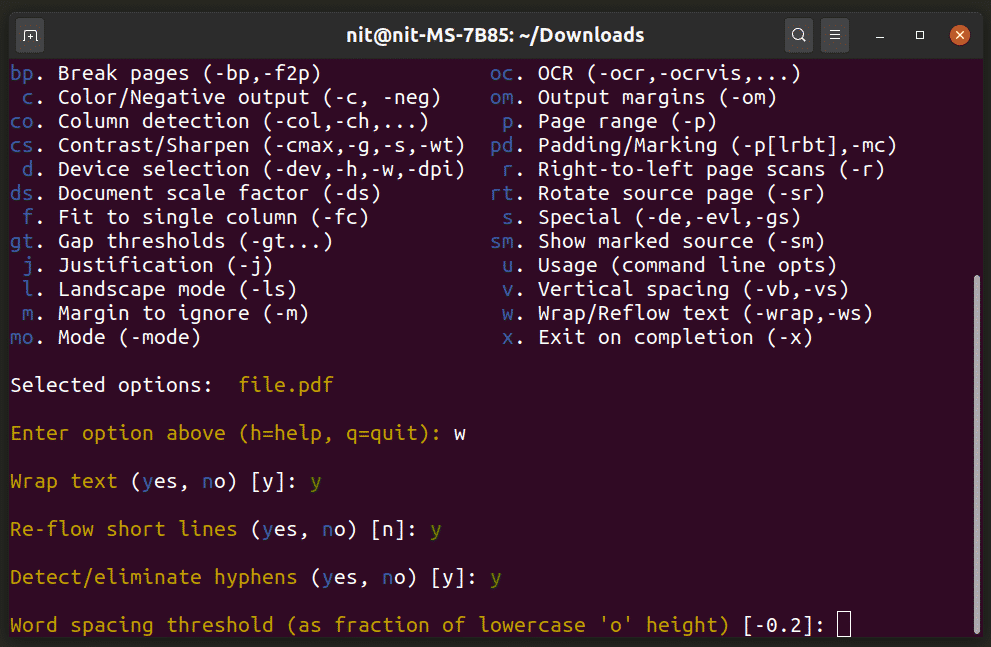 For instance, to wrap text for better readability on mobile, enter “w” and follow the on-screen prompts. If you are not sure about a prompt, you can just hit the <Enter> key to select the default value. The screenshot below shows some of the prompts you will get after entering “w:”
