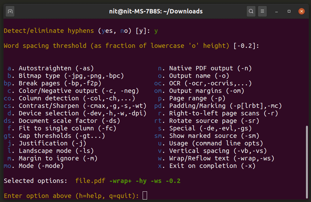 K2pdfopt features a well-made interactive command-line utility that makes it easy to enter customization options. After launching K2pdfopt, you should see the following layout:
