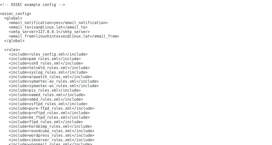This file contains OSSEC’s rules, the rule level will determine the system’s response. For example, by default OSSEC only reports on level 7 warnings, if there is any rule with level lower than 7 and you want to get informed when OSSEC identifies the incident edit the level number for 7 or higher. For example if you want to get informed when a host gets unblocked by OSSEC’s Active Response edit the following rule: