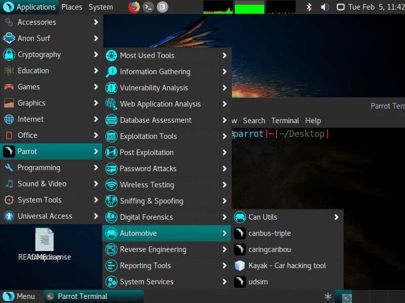 Parrot Security OS also ships with Hardware Programming & Hacking tools installed in it. These tools include Arduino IDE, GNU Radio, Kayak and other Radio sniffing tools. One of the interesting tool you’ll see here is the “Kayak – The car hacking tool” that can be used to test cars for vulnerabilities. Despite having only WiFi tools, it also has Bluetooth, RFID and NFC communication hacking tools.