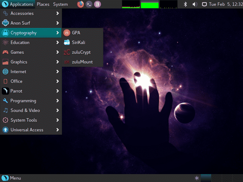 Parrot Security has pre-installed tools which can be used to encrypt files, folders and drives with passwords or private keys to keep them safe and away from hackers. These tools include TrueCrypt, Zulu Mount GPA that support both symmetric and asymmetric encryption algorithms. You can send someone an encrypted message or file so no one in the middle can read the communication.
