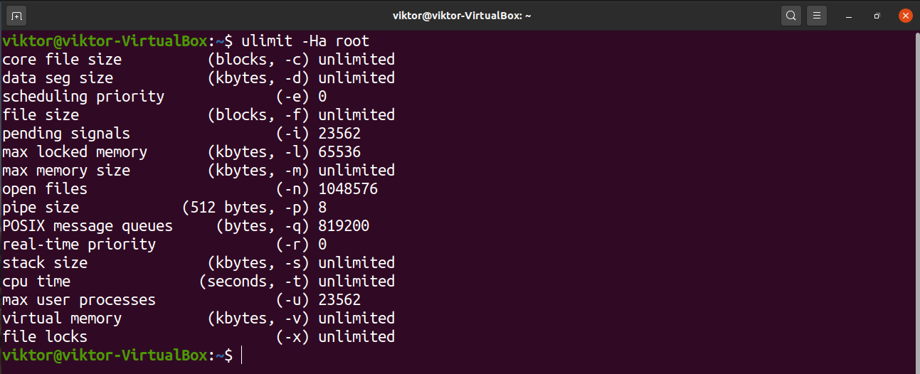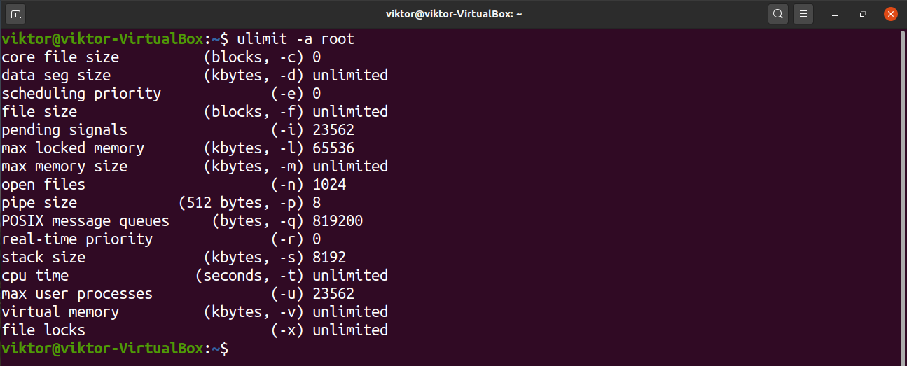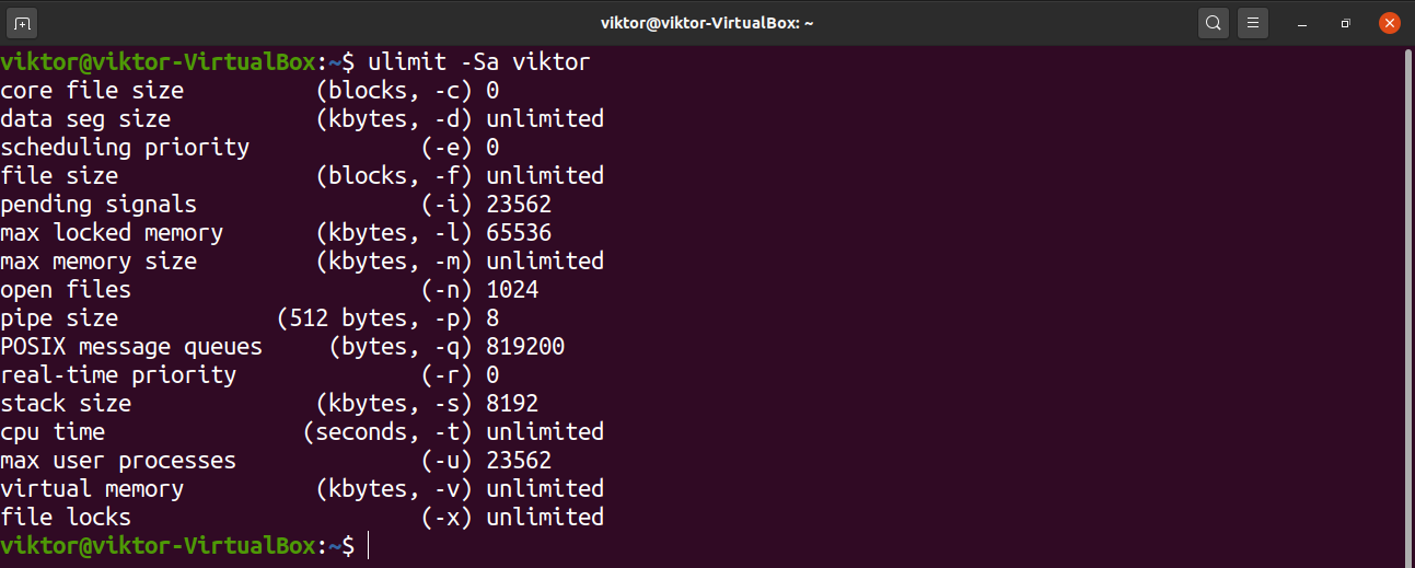 The “-a” flag will list all the options and configurations for a particular user. If no user is defined, it’ll print the limits for the current user instead.