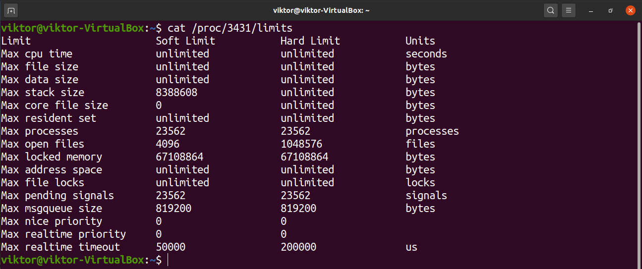 It’s possible to see the limits of a certain process. The details are located in the following file. Note that it’s a unique file for each of the processes that are currently running. Swap the PID field with the PID of the target process.