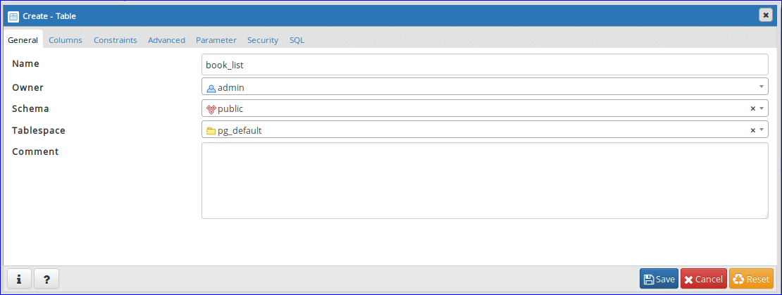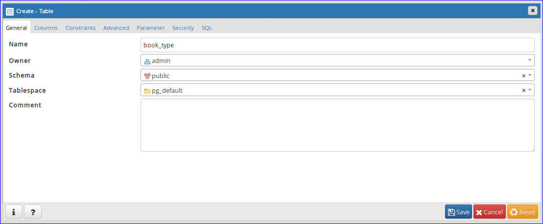 The following dialog box will appear to create a new table. Type ‘book_type’ in Name field, select Owner of the table (here, admin is selected as owner) and select Schema and Tablespace.