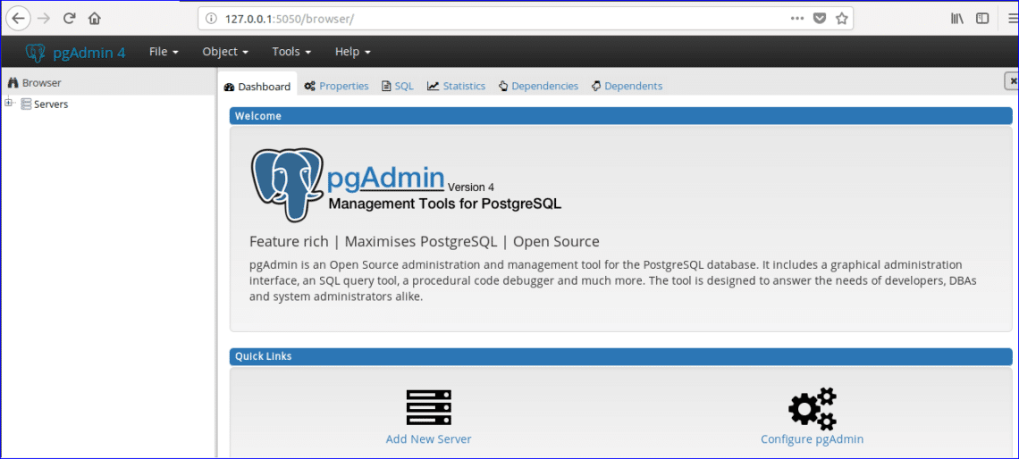 After the successful installation of pgAdmin4, open the following link from any browser to open pgAdmin4 client.