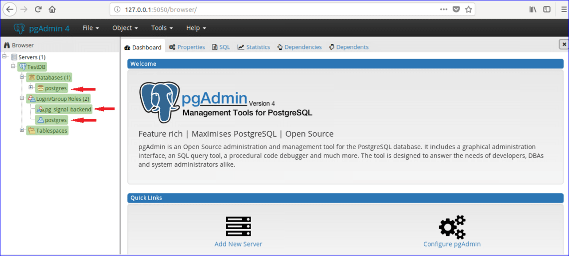If you expand the Databases and Login/Group Roles sections from pgAdmin tree control then all previously created database list and roles will be shown. Here, one database named ‘postgres’ and two login/group roles, ‘pg_signal_backend’ and ‘postgres’ are created at the time of pgAdmin4 installation.