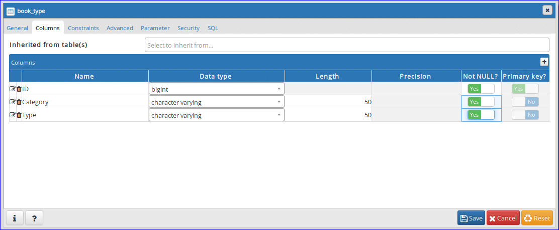 Add three mandatory fields of ‘book_type’ table like the following dialog box. Set ‘bigserial’ as data type (for adding auto increment attribute) and set ‘Yes’ in ‘Not Null’ and ‘Primary key’ fields of ID column. The value of Category and Type column can vary. So select ‘character varying’ as data type for these fields. Click ‘Save’ button to create the table.