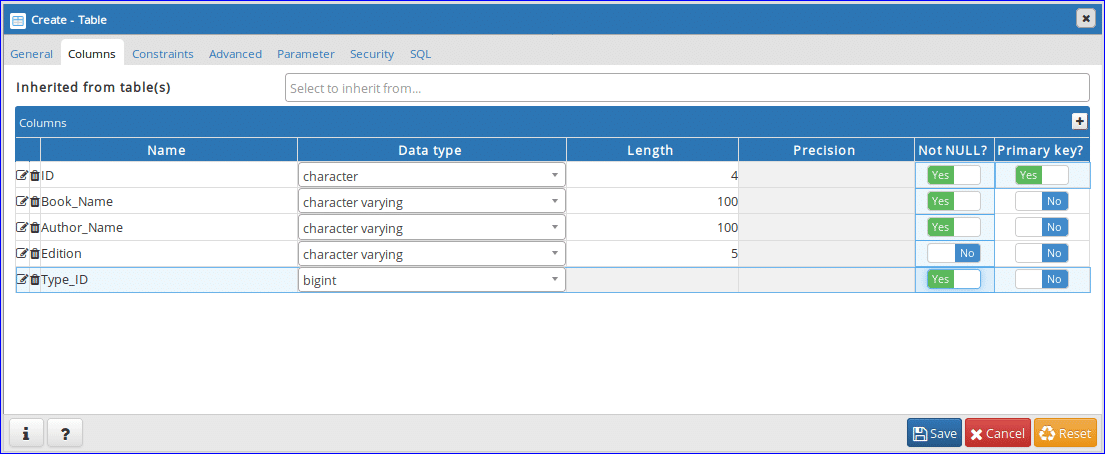 Click on Column tab and add the fields according to table requirements. Here, ID column will contain data of fixed length (4 characters). For this, ‘character’ data type is selected for ID column. The value of Book_Name, Author_Name and Edition can vary. So, ‘character varying’ data type is selected for these columns. ‘Not Null’ option is set to ‘Yes’ for Edition column to accept Null value when no data will submit.