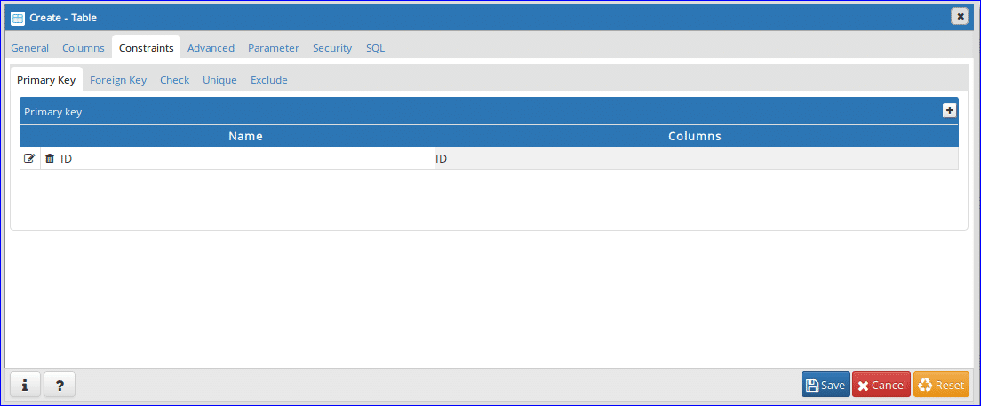 Click ‘Constraints’ tab to set primary and foreign keys. This tab contains other 5 tabs. First tab is ‘Primary Key’. This tab will display primary key information of the table. One primary key is set in the previous step which is displaying here. If you want to add or remove any primary key then you can do this task from this tab.