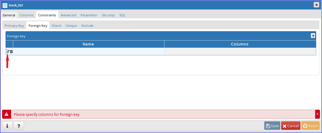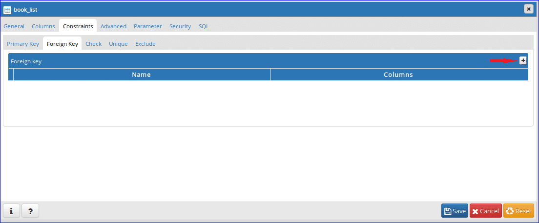 This table contains a foreign key based on the table information mentioned above. Click ‘Foreign Key’ tab to define foreign key. Click on ‘+’ button for adding foreign key.
