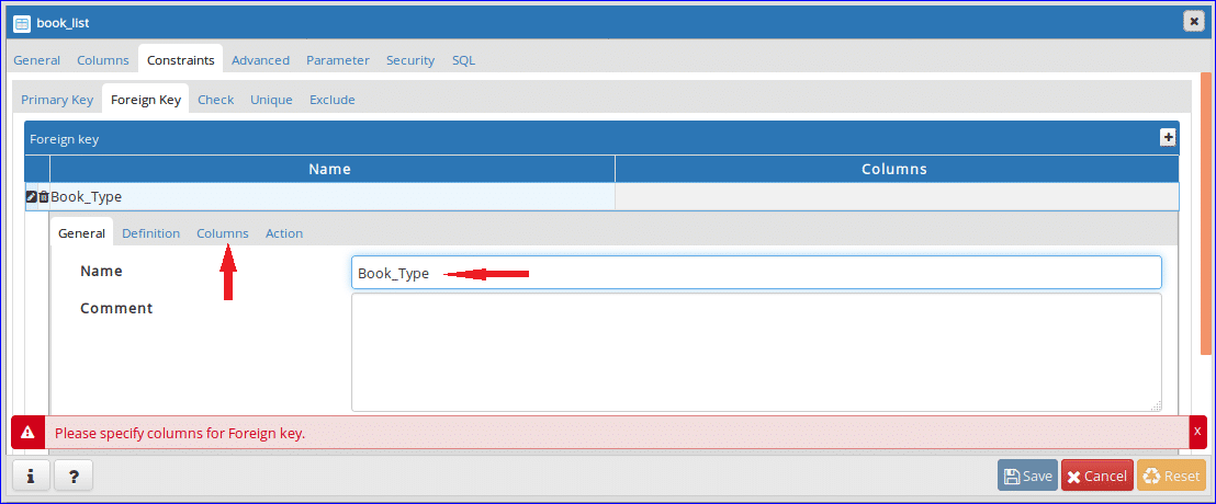 Type the name of foreign key in Name field. Here, ‘Book_Type’ is set as foreign key name. Next, click Columns tab.