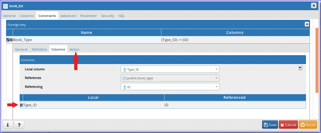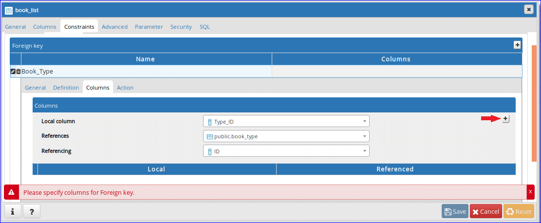 Select Local column, References and Referencing from dropdown list. For this table, Type_ID field is a foreign key and it is set as Local column. ‘book_type’ table is selected as Reference table and ID field of ‘book_type’ is selected as Referencing column. After setting, click on the ‘+’ button to add foreign key.