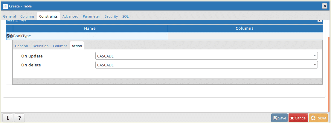 Added foreign key information will be shown in the bottom. Click on ‘Action’ to add particular action on update and delete data of reference table.