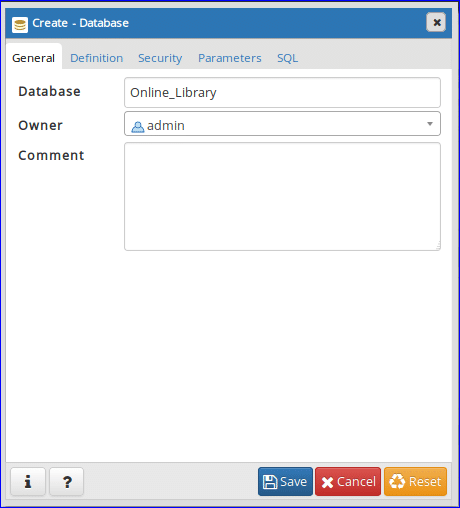 The following dialog box will appear for creating new database. Type ‘Online_Library’ in Database field and select ‘admin’ as database owner. Click ‘Save’ button to create the database.